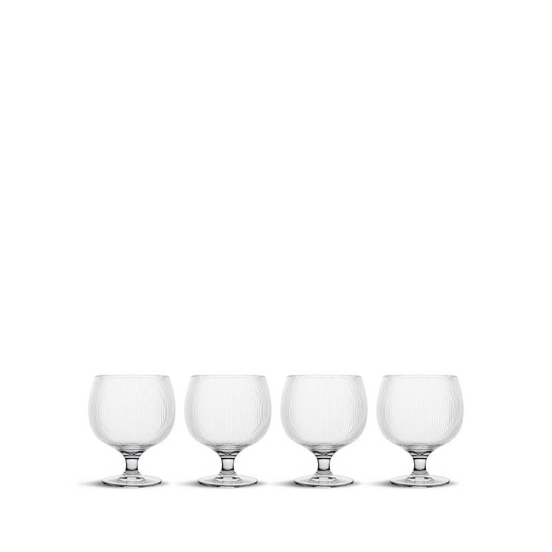 Billi wine glass has a unique characteristic design which represents Sagaform in an obvious way. With the distinct, rounded bowl embellished with stripes and its low foot this wine glass is both beautiful and functional. The practical, stackable and well thought out shape makes the glass perfect to use on many occasions. Made of recycled PET, as part of our sustainability approach. Each package holds four wine glasses from Sagaform, the perfect gift for someone who already has everything. Designed in Sweden by Studio Sagaform. Hand wash. Only for cold beverages. Made of recycled PET (rPET). Size o9x11 cm 35 cl. Material: rPET Width: 9 cm; Height: 11 cm Color: Clear