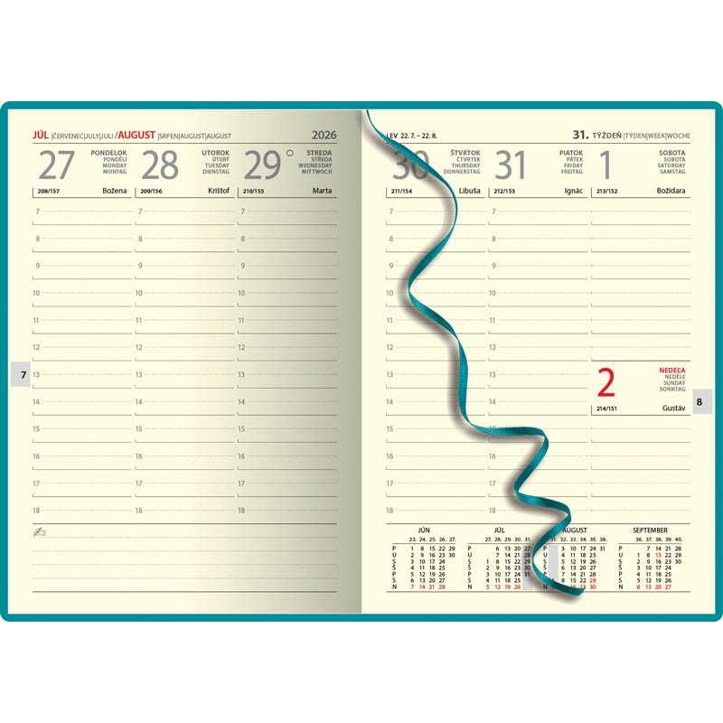 Týždenný diár Aprint Top 2026 v čiernej farbe. Rozšírenie obľúbeného radu Aprint o variant s gumičkou na zatváranie a pútkom na ceruzku. Týždenný rozvrh s česko-slovenským kalendáriom a doplnkovou angličtinou, nemčinou, maďarčinou a ruštinou.• kalendárium od decembra 2025• mesačný plánovací kalendár 2026 • mesačný plánovací kalendár 2027• ročný plánovací kalendár 2026–2027 • pracovný plánovací kalendár • sviatky Českej a Slovenskej republiky a zahraničné sviatky mapa Českej a Slovenskej republiky • miesto pre osobné údaje • textilná záložka • perforované rožky • priestor na poznámkyRozsah: 144 strán. Rozmer: 15 x 21 x 2 cm. Hmotnosť: 0,28. Papier: 90 g/m2. Väzba: tuhá knižná s gumičkou a pútkom na ceruzku. Kalendárium: 6 jazyčné (CZ, SK, GB, DE, HU, RU) .