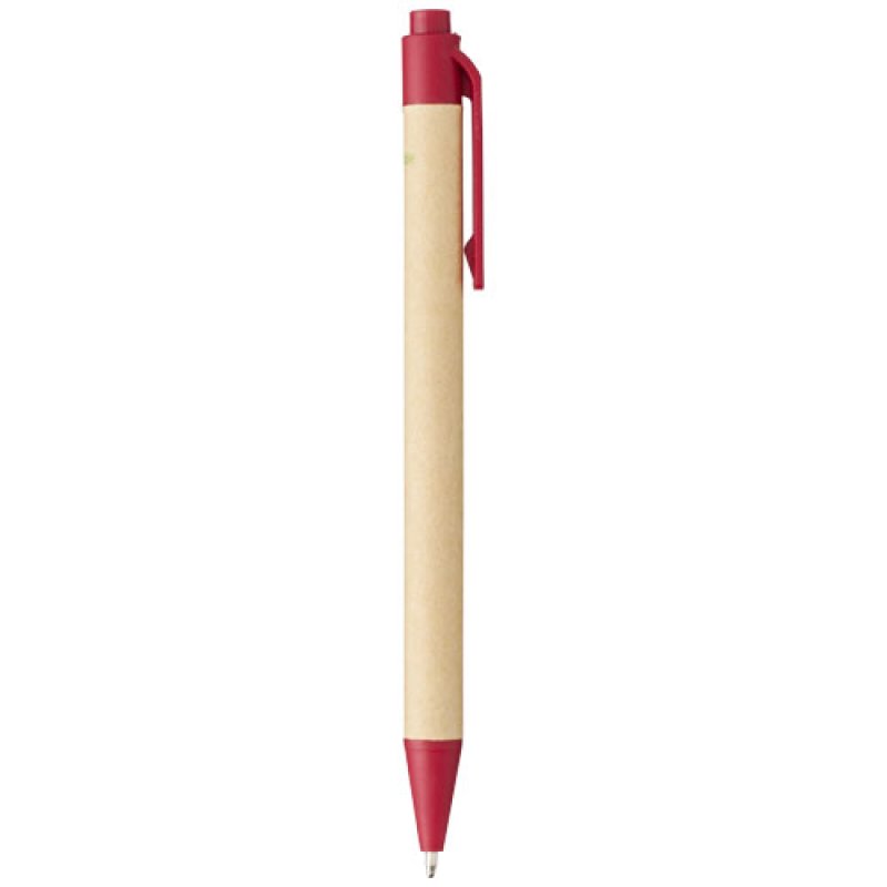 Ekologické kuličkové pero se stiskacím mechanismem, tělem vyrobeným z biologicky odbouratelného papírového materiálu a s doplňky z kukuřičného plastu, dostupné v různých barvách. Barva recyklované lepenky se může různit.