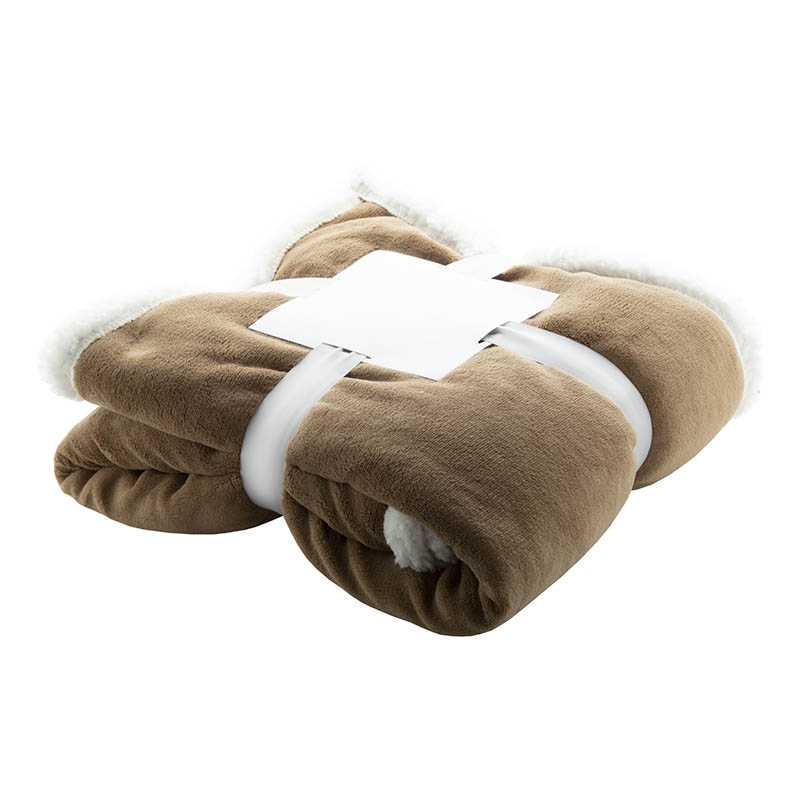 Dvojvrstvová prikrývka s korálovým fleecom 200 g/m2 a obojstrannou podšívkou z fleecu 210 g/m2. Previazané stuhou s papierovou etiketou na potlač.