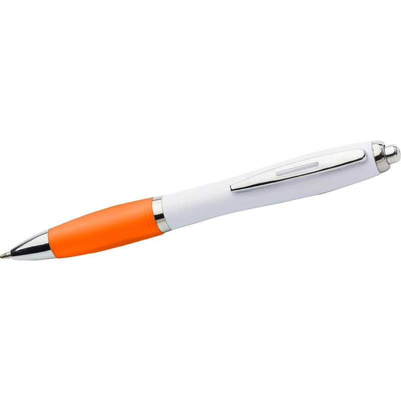 Plastové guľôčkové pero s modrou náplňou a mäkkou vrúbkovanou gumenou úchytkou.