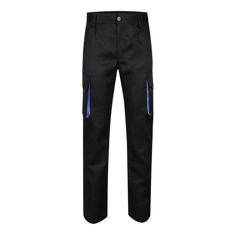 Front zip with button Reflective tape on lower legs Elastic waistband Back safety seam Darts Five pockets: 2 French pockets 2 patch pockets with cover flaps and Velcro 1 back pa