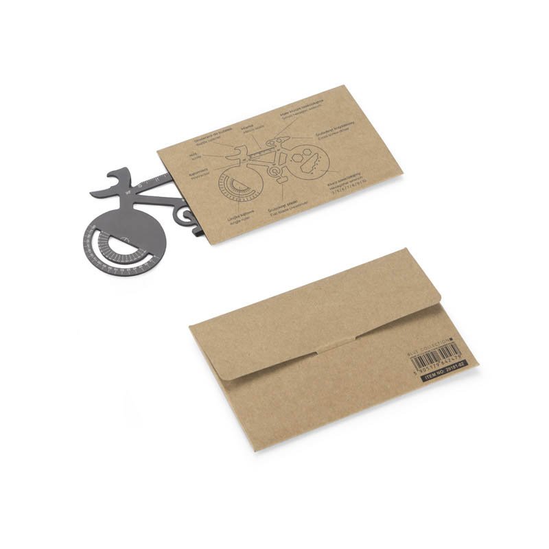 Multifunkčné náradie pre cyklistov značky Schwarzwolf. Obsahuje 7 druhov nástrojov v rôznych veľkostiach: centrkľúč, plochý skrutkovač, krížový skrutkovač, imbus 4/5/6mm, plochý šesťhranný kľúč v šiestich veľkostiach od 3.3 až 18 mm, otvárač fliaš a pravítko. Balené v darčekovej krabičke. Materiál: nerezová oceľ 2Cr13. Odporúčaná technológia potlače: laser L1. Maximálna veľkosť potlače: 12 × 5 mm. Rozmery: 11,5 × 3,8 × 1,1 cm. Uhlíková stopa: gCO2 e1396.
