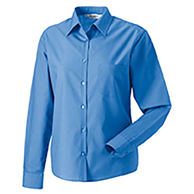 Classic single-button collar. Rounded 2 button adjustable cuffs. V-shaped pocket over left chest. Rounded hem. Spare buttons. Easy Care. Značka : RUSSELL . Materiál : 65% polyester / 35% bavlna ; biela 115g/m2 , farebné 110g/m2