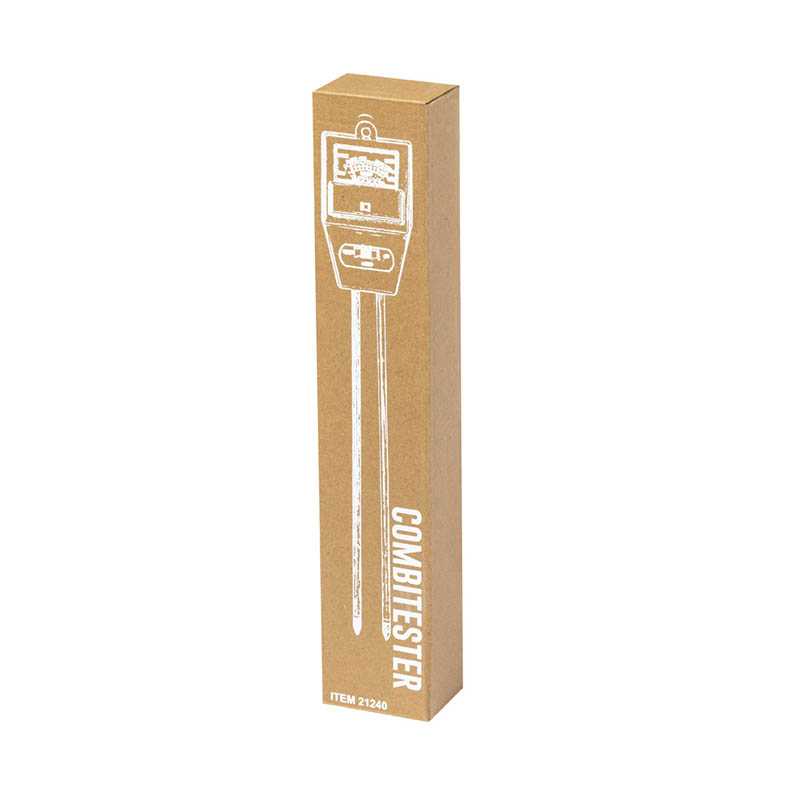 NOVINKA 2025. 3-in-1 soil hygrometer for better control of crop or plant growth. It measures humidity, pH and light exposure, and switches functions at the touch of a button. Valid for outdoor and indoor use, with two probes to insert into the soil at root level and obtain optimum reading results. With instructions in English and Spanish, presented individually in a kraft design box.