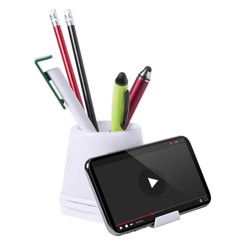 NOVINKA 2025. Multifunctional pen holder with light, specially designed for laser branding and backlighting the logo.With smartphone holder and integrated 15W wireless charger, compatible with devices equipped with Qi wireless charging technology. Including 2 USB outputs (5V DC 2A) and 150cm Type C charging cable. Non-slip base and presented in an individual kraft design box, with instruction manual in English and Spanish.Manufactured according to RoHS standards and in compliance with the following safety requirements:Overheating protection system.Over-charge protection system.Blocking system to prevent short circuits.