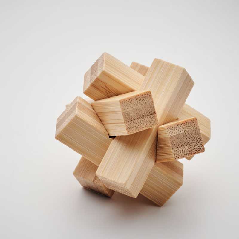 Dřevěný kostičkový hlavolam v bavlněném váčku. Reklamní potisk nelze provést na dílky hlavolamu.
