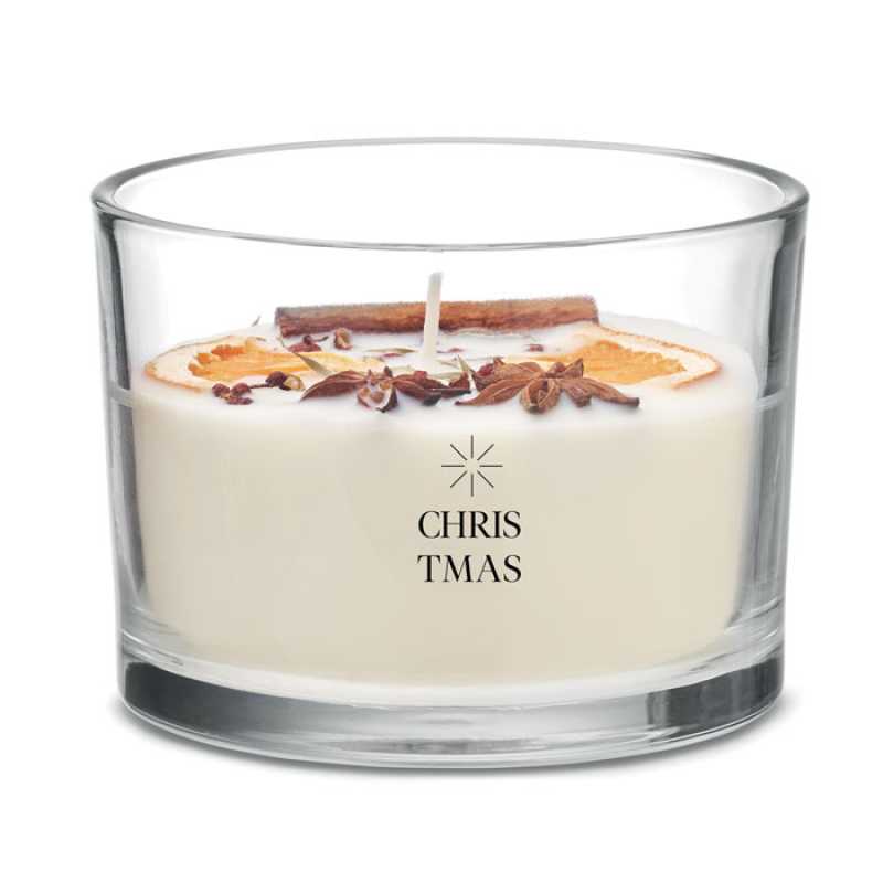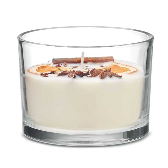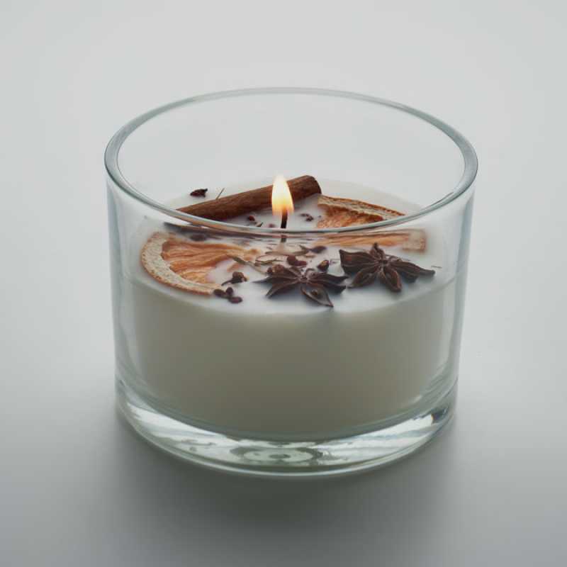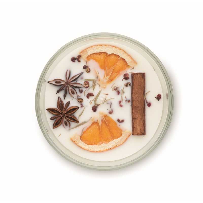 Rostlinná vosková svíčka 300g s vůní skořice a citrusů se sušenými květinami a ovocem ve skleněné nádobce. Doba hoření: cca 50 hodin.
