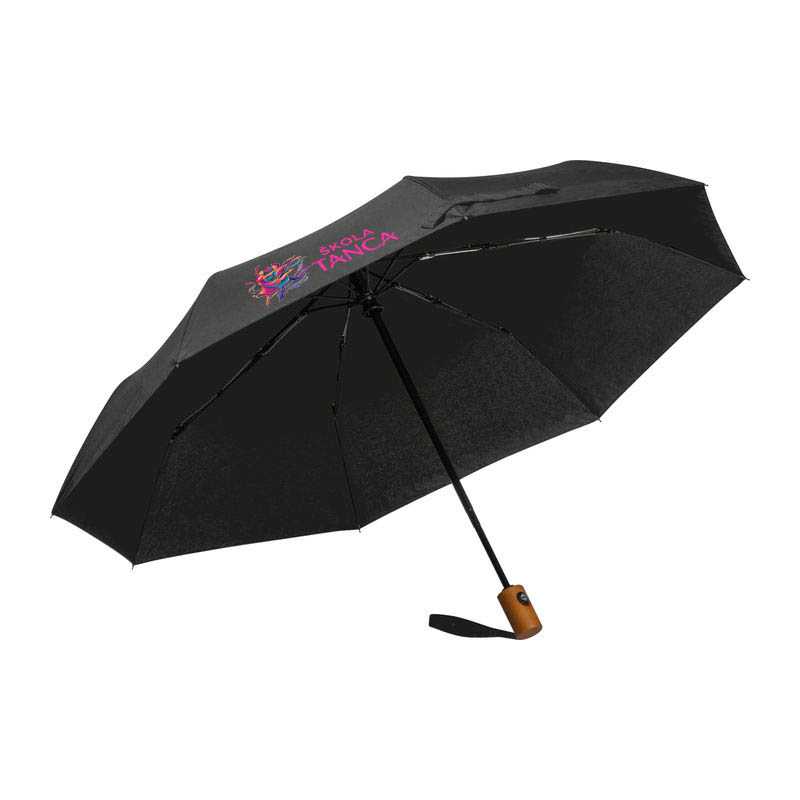 Automatický vreckový dáždnik so sklolaminátovým rámom, poťahom z recyklovaných PET fliaš, drevenou rukoväťou a remienkom na zápästie.