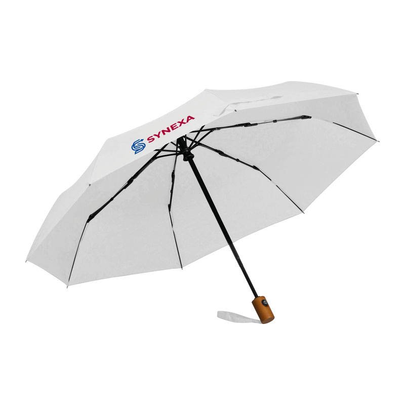 Automatický vreckový dáždnik so sklolaminátovým rámom, poťahom z recyklovaných PET fliaš, drevenou rukoväťou a remienkom na zápästie.