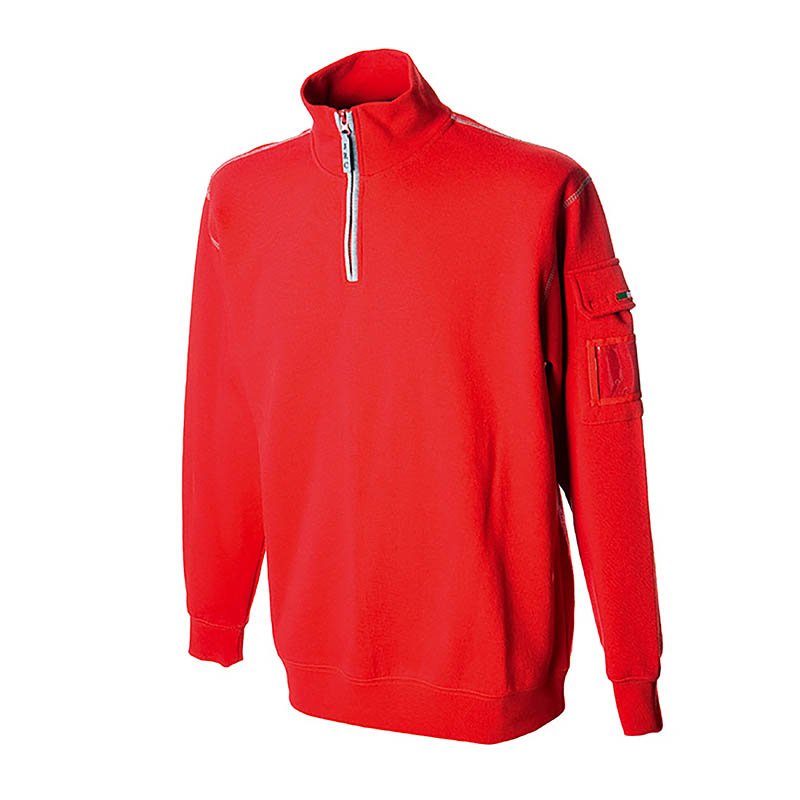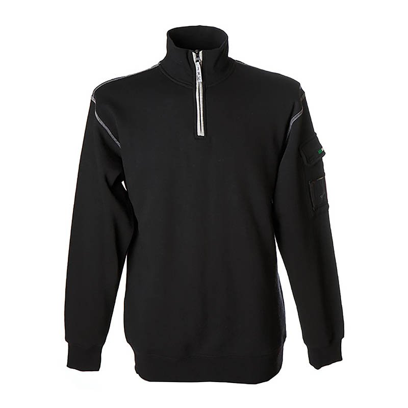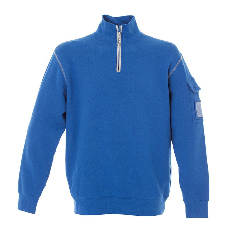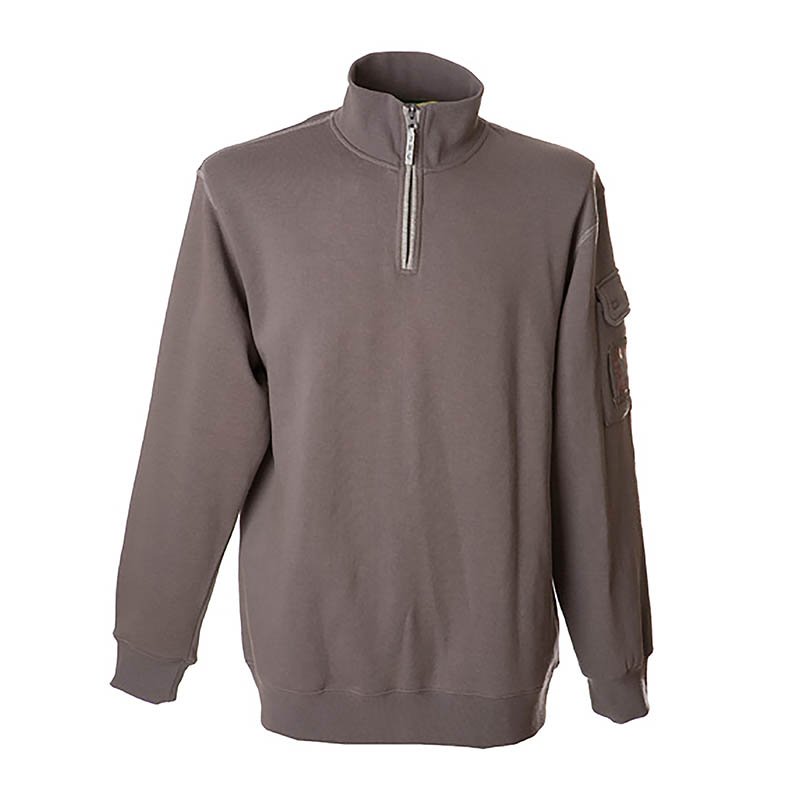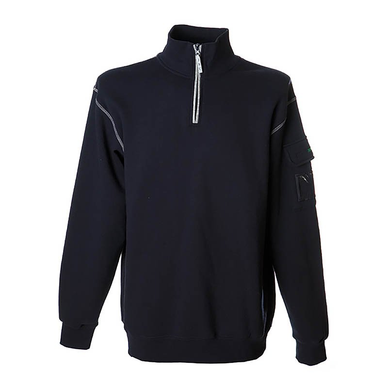 80 % bavlna/20 % polyester (popolová prskaná: 79 % bavlna/20 % polyester/1 % viskóza).Úprava LSF (Low Shrinkage Fleece).3-vláknový kartáčovaný flís z česanej bavlny.Vsadené rukávy.Zips pri krku s plastovým zipsom v rovnakej farbe.Kontrastné podlepený výstrih (kontrastná oxfordská sivá pre všetky farby, okrem tela v oxfordskej sivej a popolovej prskanej, kde je páska pri krku v námorníckej).Rebrované manžety a lem.Certifikát STANDARD 100 podľa OEKO-TEX®N° CQ1007/7, IFTH.