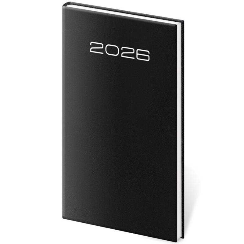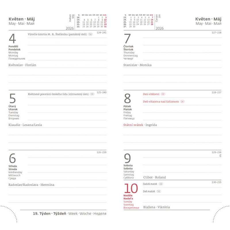 Nová, cenovo dostupná rada diárov s obálkou z ekologického papiera spája štýl a udržateľnosť. Týždenné rozloženie s česko-slovenským kalendáriom a doplnkovou angličtinou, nemčinou, maďarčinou a ruštinou.• kalendárium od decembra 2025• ročný plánovací kalendár 2026–2027 • pracovný plánovací kalendár • sviatky Českej a Slovenskej republiky a medzinárodné sviatky • rozšírený zoznam českých mien • miesto pre osobné údaje • perforované rožky• priestor pre poznámkyRozsah: 128 strán. Rozmer: 9 x 15,5 x 1 cm. Hmotnosť: 0,08. Papier: 70 g/m2 krémový papier. Väzba: tuhá knižná. Kalendárium: 6 jazyčné (CZ, SK, GB, DE, HU, RU) .