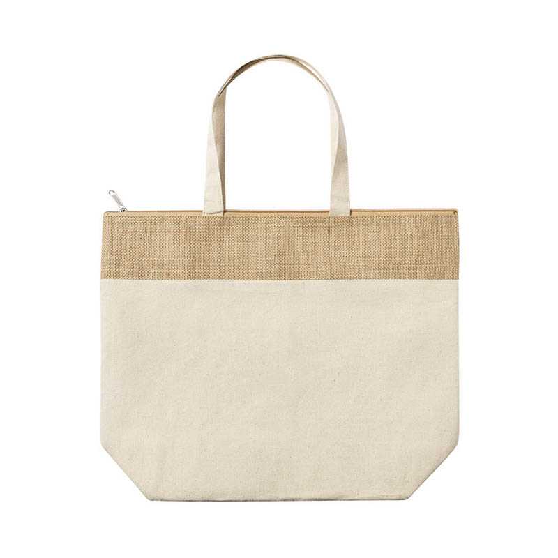 NOVINKA 2025. Thermal bag in resistant cotton material 225g/m2, with top side in laminated jute and including cotton handles. Main compartment with zip and metal puller, with aluminium isothermal interior. Stitched finish, with medium sized reinforced handles and resistance up to 7kg in weight.