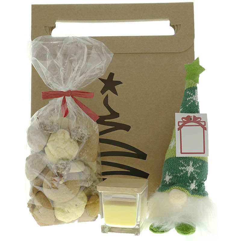 Vianočné koláčiky 250g, Vonná sviečka, Vianočný trpaslík so svetlom. Darčeková taška 30x23x10 cm