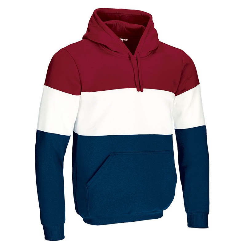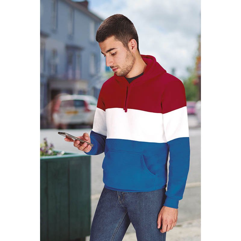 Three-Tone Hoodie with Kangaroo Pocket.Made of plush polyester fabric with a soft cotton-like touch for a comfortable feel with an inner brushed for optimal thermal insulation and extra comfort.Made of interlocked and sewn pieces in different colours, with double stitching for a better finish. Elasticated ribbed cuffs and waistband for comfortably fitting, double layer hood with regulable drawstring for a better adjustment.A large central kangaroo pocket for convenient storage. Suitable marking methods: screen printing, embroidery, transfer printing, badges, shields. Ideal as promotional clothing, merchandising and casual wear.
