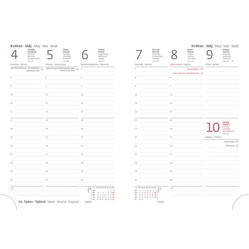 Nový rad diárov s výrazným letopočtom. Povrch má jemnú štruktúru a je vhodný pre všetky typy razieb. Týždenné rozloženie s česko-slovenským kalendáriom a doplnkovou angličtinou, nemčinou, maďarčinou a ruštinou.• kalendárium od decembra 2025 • ročný plánovací kalendár 2026–2027 • pracovný plánovací kalendár • sviatky Českej a Slovenskej republiky a medzinárodné sviatky • rozšírený zoznam českých mien • miesto pre osobné údaje • perforované rožky• priestor pre poznámkyRozsah: 128 strán. Rozmer: 9 x 15,5 x 1 cm. Hmotnosť: 0,08. Papier: 70 g/m2 krémový papier. Väzba: tuhá knižná. Kalendárium: 6 jazyčné (CZ, SK, GB, DE, HU, RU) .