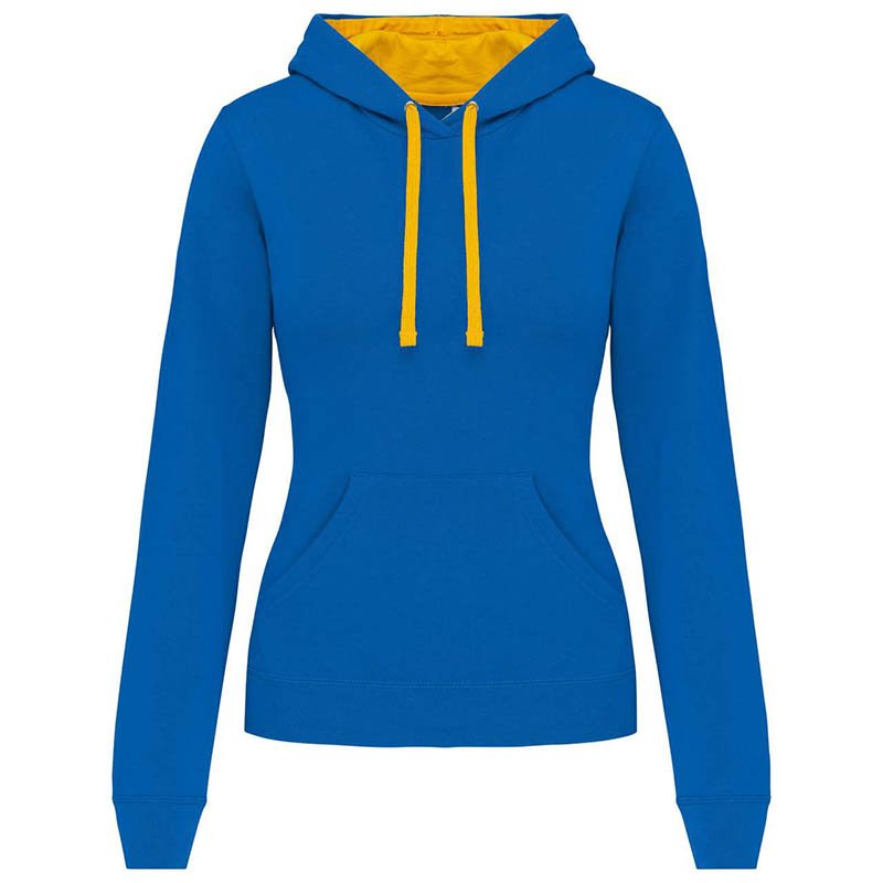 "Lady’s cotton – polyester sweater - Special dry fabric - Lined hood - Full zip with waterproof cover - Raglan sleeves - Two zip-pocket - Contrasting details - Colored tape inside collar - Ribbed cuffs and band at the waist"