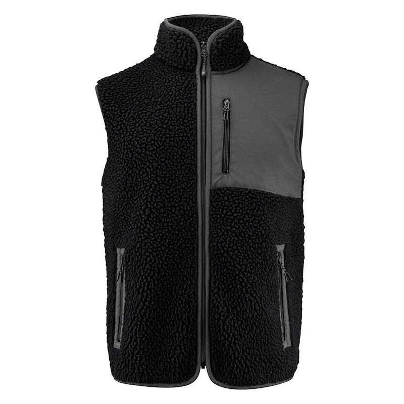NOVINKA 2024. Bicolour sherpa fleece vest. Contrast fabric on chest and piping along the edges of the seams. Chest pocket and side pockets with zippers. Colors: 600 navy, 704 moss green, 900 black Sherpa fabric: 100% Recycled Polyester, 400 g/m2 (GRS) Contrast fabric: 50% Recycled Polyester 50% Polyester, 160 g/m2 S-4XL