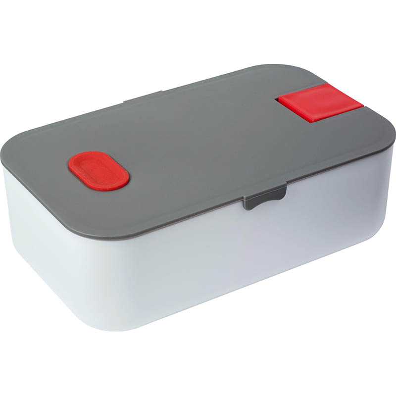 PP and silicone lunchbox with a capacity of 850 ml. The inside includes one separator. The closure on the lid doubles as a phone holder.