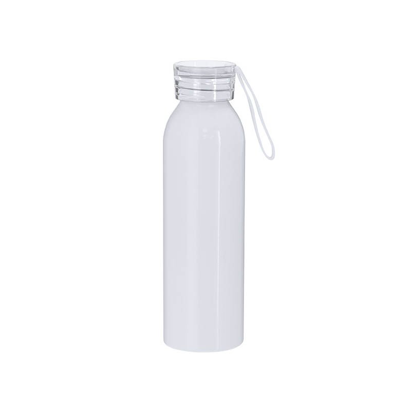 NOVINKA 2025. 650 ml capacity bottle made of durable aluminum. In shiny white color, specially designed for sublimation. With a translucent screw cap and matching strap for easy transport. BPA-free.