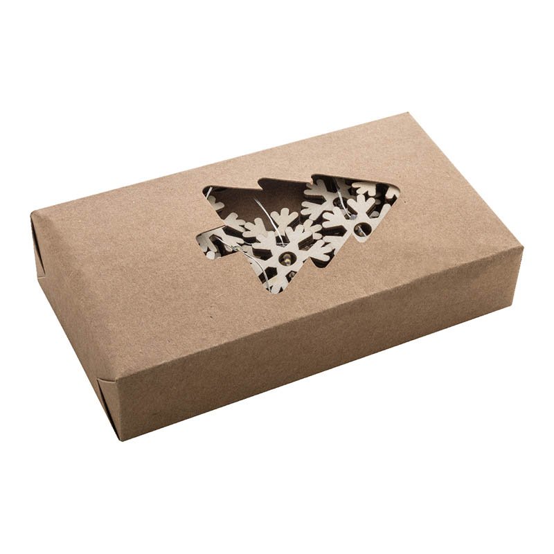NOVINKA 2025 XMASS. Vianočná svetelná dekorácia s 20 LED svetlami v tvare drevenej snehovej vločky. Funguje na 2 AA batérie, bez batérií. S tlačidlom ZAP/VYP na puzdre na batérie. V krabičke z kraftového papiera.