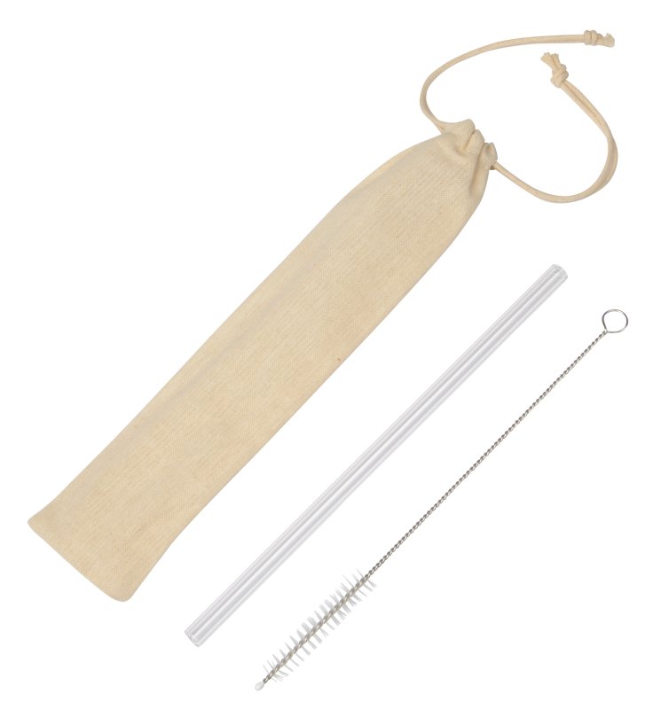 NOVINKA 2025. Reusable straw in stainless steel material. Including cleaning accessory and presented in a 100% natural cotton bag with closing ribbons.