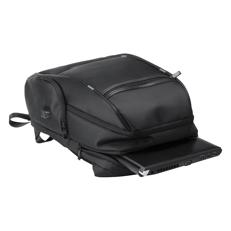 Vodeodolný nylónový ruksak s viacerými priehradkami na zips, vystuženou priehradkou na notebook (15"), chrbtom a popruhmi. So vstavaným USB pripojením na power banky.