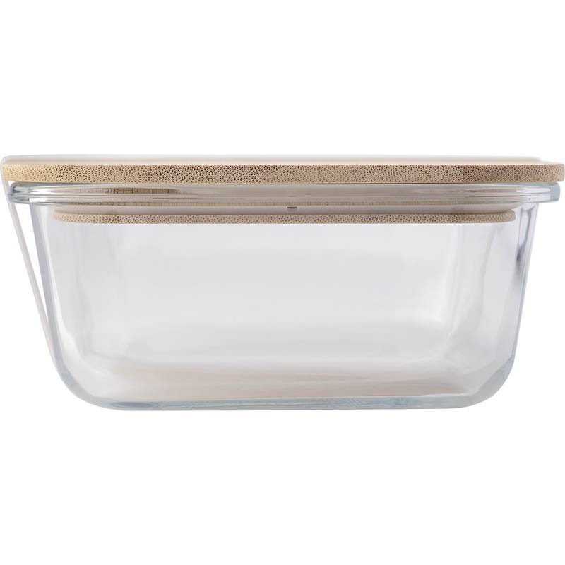 Glass lunch box with a bamboo lid and silicon strap. Capacity: approximately 900 ml.