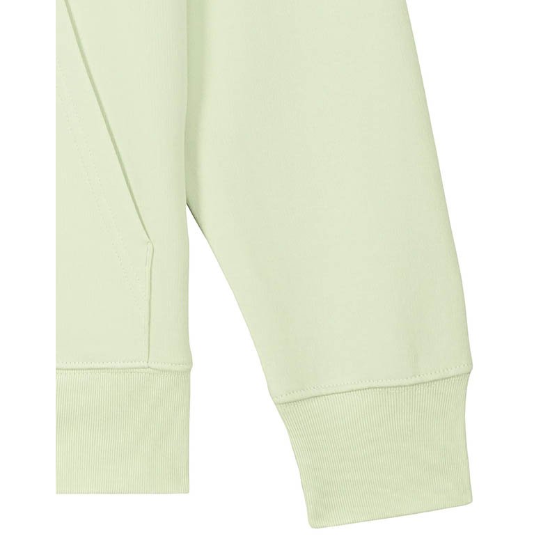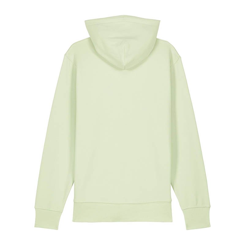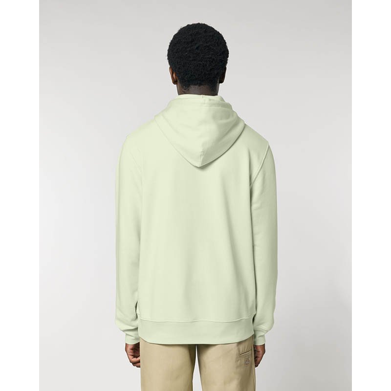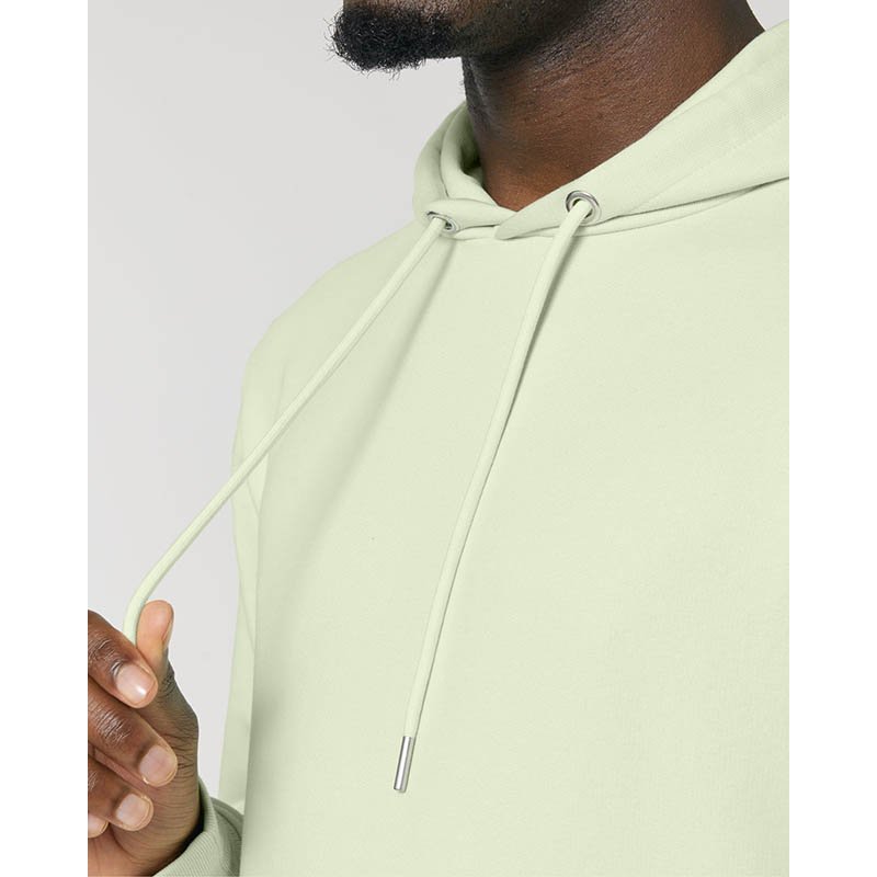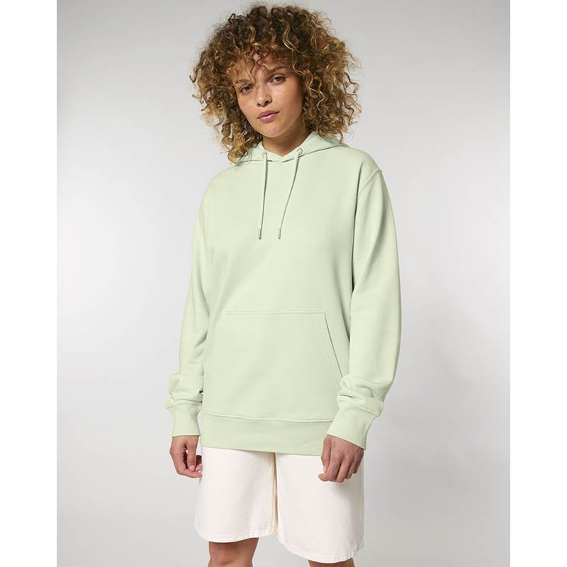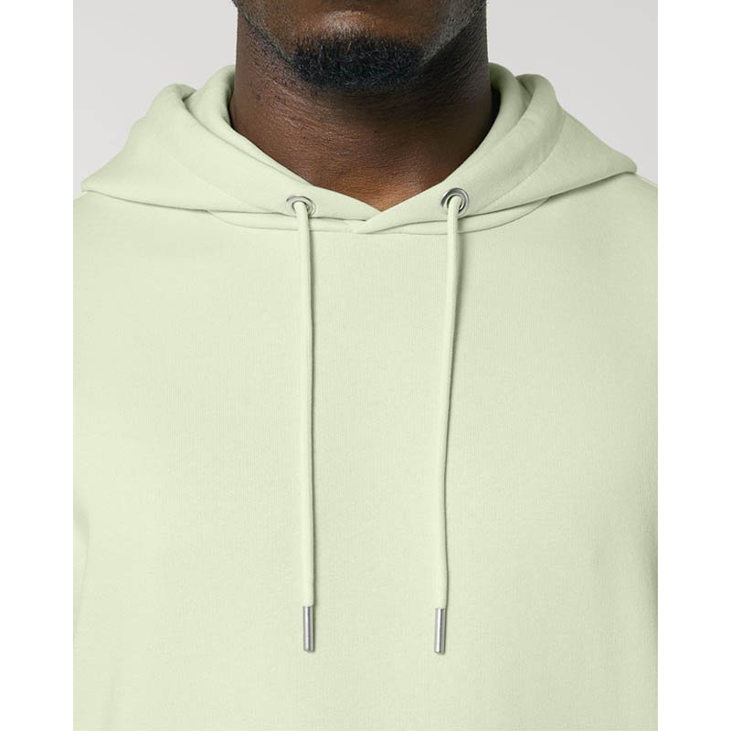 85 % organická bavlna/15 % recyklovaný polyester.Prstencovo spriadaná česaná bavlna.Rovný strih.3-vrstvový kartáčovaný flís, LSF (Low Shrinkage Fleece: predzrazený flís).1/2 kruhu vzadu.Klokanie vrecko.1 x 1 rebrovaný spodný okraj a manžety.Dvojité prešívanie na manžetách, prieramkoch, spodnom okraji a 1/2 kruhu.Podlepený výstrih vnútri na zadnej strane.Podšitá kapucňa z hlavného materiálu so zaväzovaním na šnúrku.Okrúhla šnúrka s recyklovanými kovovými koncovkami a očkami.