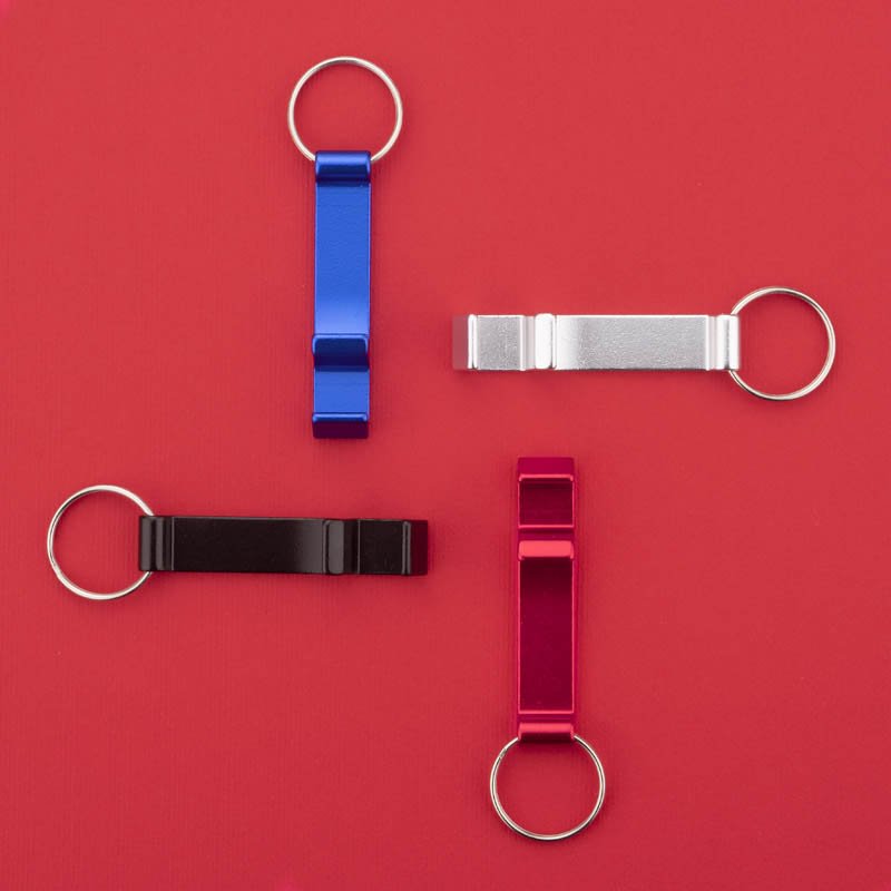 Otvárač na fľaše vyrobený z recyklovaného hliníka s krúžkom na kľúče.