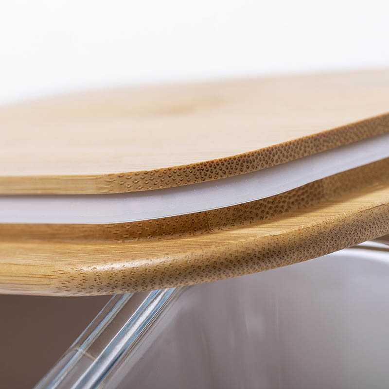 NOVINKA 2025. Glass salad bowl with bamboo lid and silicone closing band. Capacity 1200 ml. Special reinforced glass (borosilicate), thin but strong. Individually packaged in a brown cardboard box.