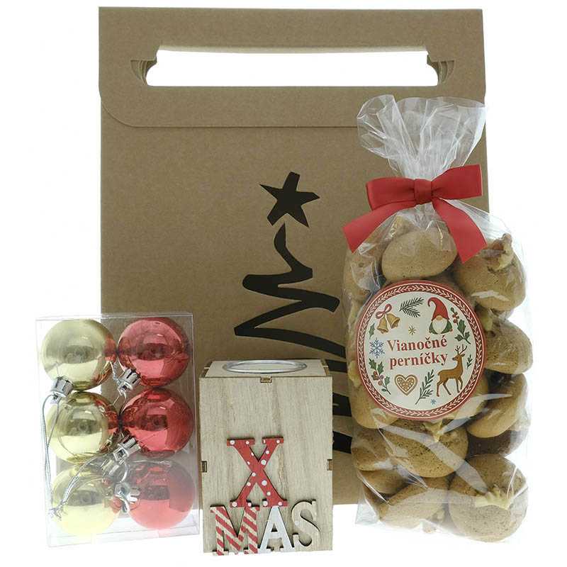 Vianočné ozdoby, Vianočné perníky 250g, Stojan na sviečku. Darčeková taška 30x23x10 cm