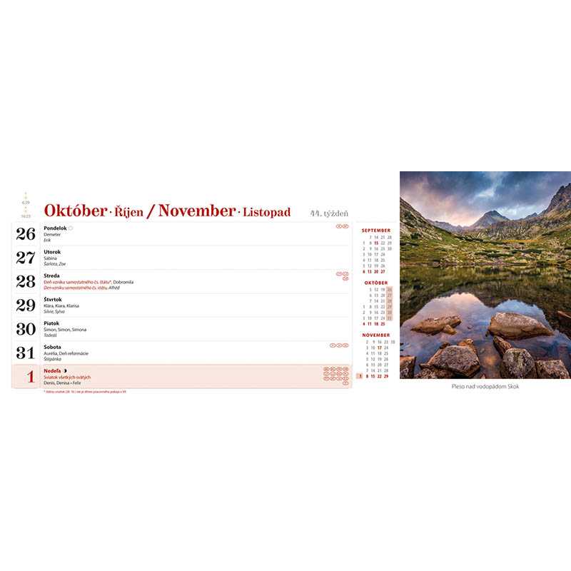 Pracovný kalendár Obrázky zo Slovenska 2026. Formát kalendára: 30,1 x 15 cm. Kalendárium: slovenské týždenné stľpcové. Počet strán kalendára: 60 + 2. Stojanček: s plným dnom. Priestor na potlač: 30,1 x 3,5 cm. + dane a ročné obdobia, znamenia zverokruhu, citáty, sviatky v EÚ, 3mesačný prehľad