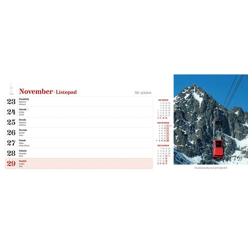 Tatranské štíty, príroda a ľudia, zachytené v stolovom týždňovom kalendári s riadkovým delením, daňovými pripomienkami, fázami Mesiaca, východmi a západmi Slnka, štátnymi sviatkami všetkých krajín EÚ, školskými prázdninami, slovenskými a českými menami (plus netradičné mená).