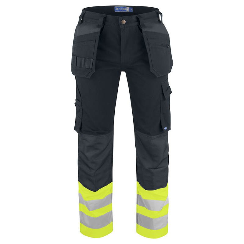 Flat fronted waistpants. Side pockets in front, safety pocket with zipper on right side. Two leg pockets with pen compartment, left one with room for mobile telephone. Folding rule pocket. Front edge of pockets, lower part of back pockets polyamide-reinforced, edge of folding rule pocket, pen pockets reinforced and lower part of leg pocket and rear lower edge of pants polyamide-reinforced. Knee protector pockets on inside. Loops under back pockets and leg pockets for attaching Inbags. Max 50 washes at 60oC. Material: 68% polyester 32% cotton, 275 g/m2 Reinforcements in 100% polyamide Safety class: EN471-CLASS 2 Colour: ProJob yellow-10, orange-17, yellow black 11 Size: C44–C62, D84–D120, C146–C156