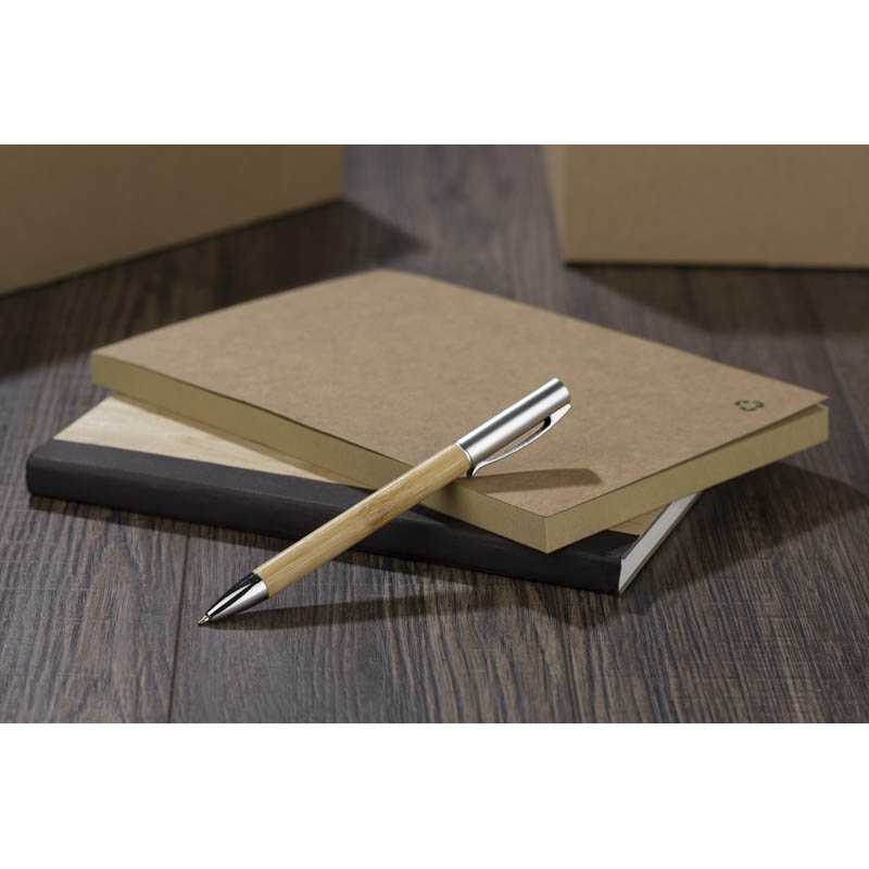 Písacia sada pozostávajúca z modrého guľôčkového pera a pentelky z bambusu so striebornými aplikáciami. Sada je dodávaná v ekologickej kartónovej krabici.