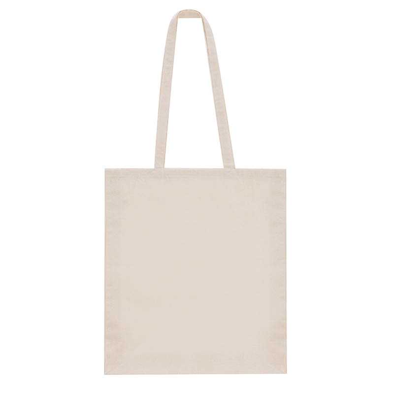 NOVINKA 2025. Bag made in cotton, natural finish and 140g/m2. Stitched finish, with base gusset and long reinforced handles (70 x 2.5 cm). Resistance up to 6 kg in weight.