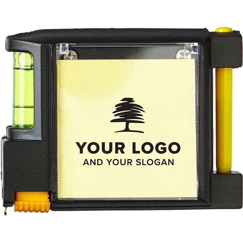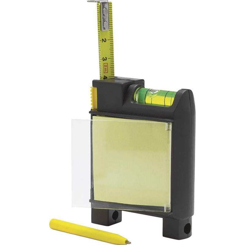 ABS tape measure (2 meter) with spirit level, memo pad, pen with blue ink, and belt clip.
