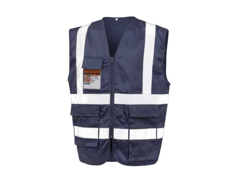 Easy to decorate, security vest in durable polycotton, with extra length pocket suitable for control or checking apparatus.