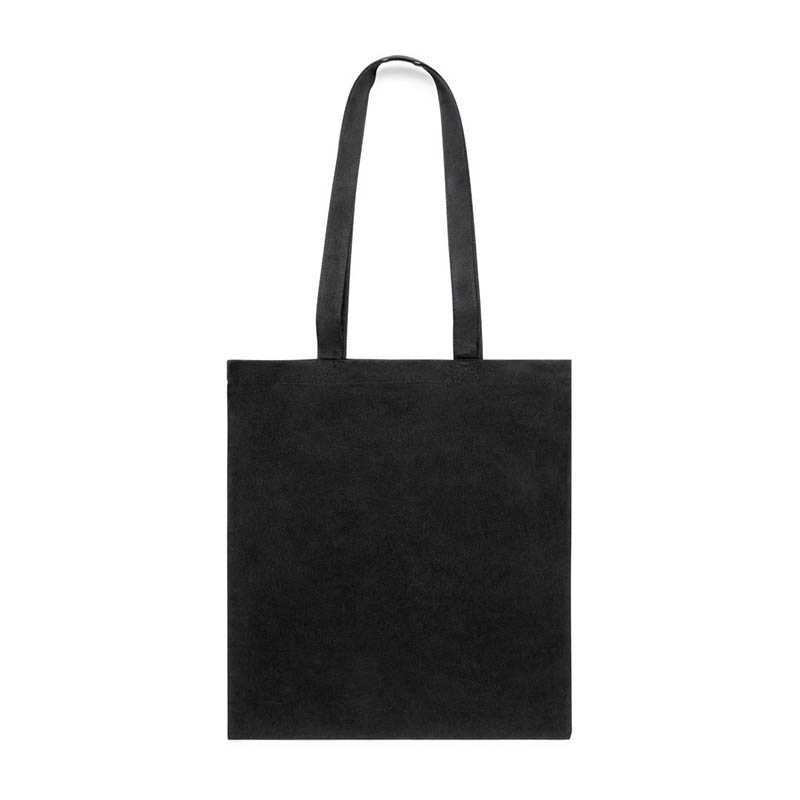 NOVINKA 2025. Nature line bag, made of 140g/m2 recycled cotton. Stitched finish and with long reinforced handles (70 x 2,5cm). Gusset on base and available in natural and black colours, with recycled cotton label on the outside. Resistance up to 6 kg in weight.GRS (Global Recycled Standard) certification available, guaranteeing the recycled origin of the material used to manufacture the product.