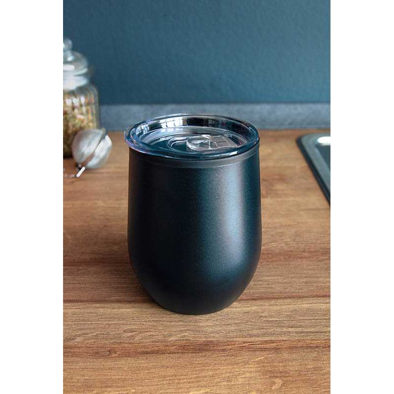 350ml hrnček s vonkajšou stranou z nerez ocele a vnútornou stranou z polypropylénu, s vrchnákom a spodnou časťou v čiernej farbe.