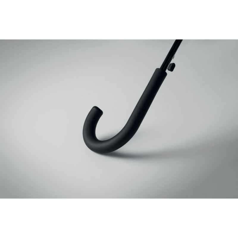 Deštník 23 palců s automatickým otvíráním. Černě pokovená konstrukce, žebra ze skelných vláken a panely z tkaniny 190T pongee. Plastové špičky a vršek. Pogumovaná ohnutá rukojeť z PP plastu. Manuální zavírání.