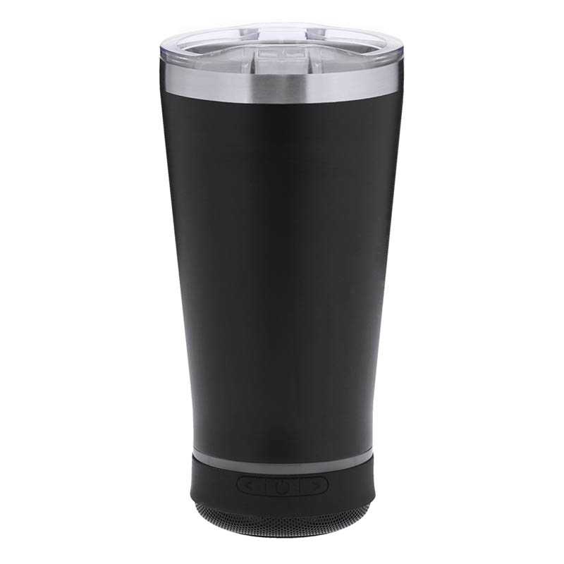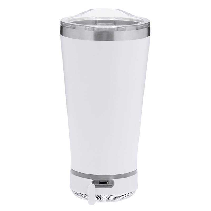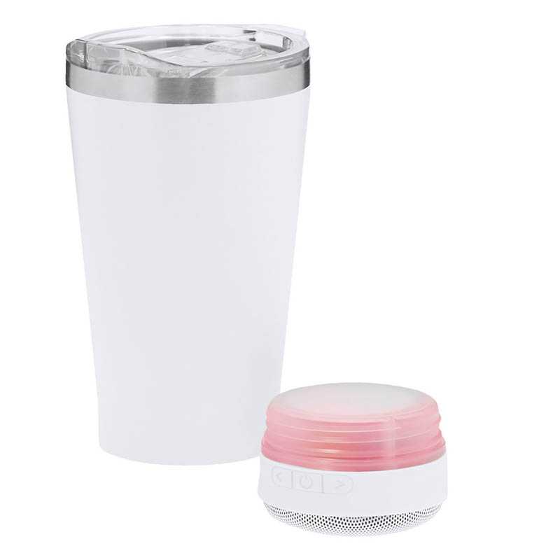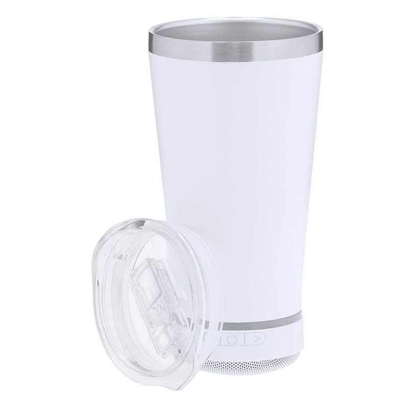 NOVINKA 2025. Insulated Cup with integrated 3W Bluetooth® 5.3 Speaker. With 440ml capacity and made in double walled stainless steel, ensuring maximum durability and excellent temperature preservation of both hot and cold beverages. It is ideal for your desk, table, or any surface where you can enjoy your favorite drink. It includes a snap-on closure and an easy-open, BPA-free dispenser. With a matching non-slip base provides stability. The Bluetooth speaker integrated at the base of the cup is easily removable using its screw-on system, and includes intelligent RGB LED illumination, which is synchronised to the rhythm of the music, creating a unique visual and listening experience. In addition, the hands-free function enables call answering without leaving what one is doing.