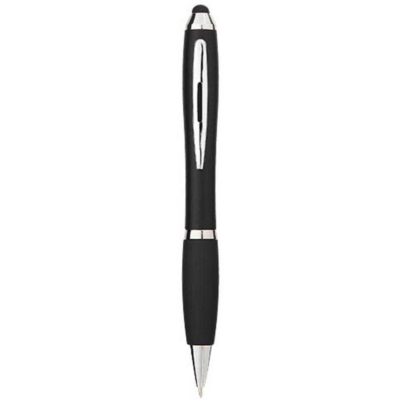 ABS and metal ballpen with rubber grip and rubber tip suitable for capacitive screens. Black ink.