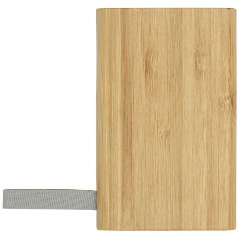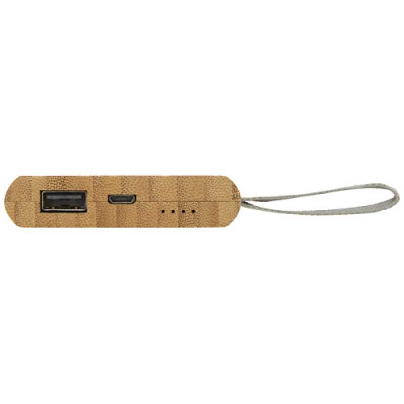 Bambusová záložní powerbanka o kapacitě 5 000 mAh pro nabíjení mobilních telefonů nebo jiných digitálních zařízení. Je vybaven LED indikátorem a popruh z materiálu RPET. Baleno v dárkové krabičce a dodáváno s návodem k použití (oba jsou vyrobeny z udržitelného materiálu). Součástí balení je nabíjecí kabel Micro USB. Vzhledem k tomu, že bambus je přírodní produkt, mohou se mezi jednotlivými výrobky objevit mírné rozdíly v barvě a velikosti, které mohou mít vliv na konečný výsledek dekorace.