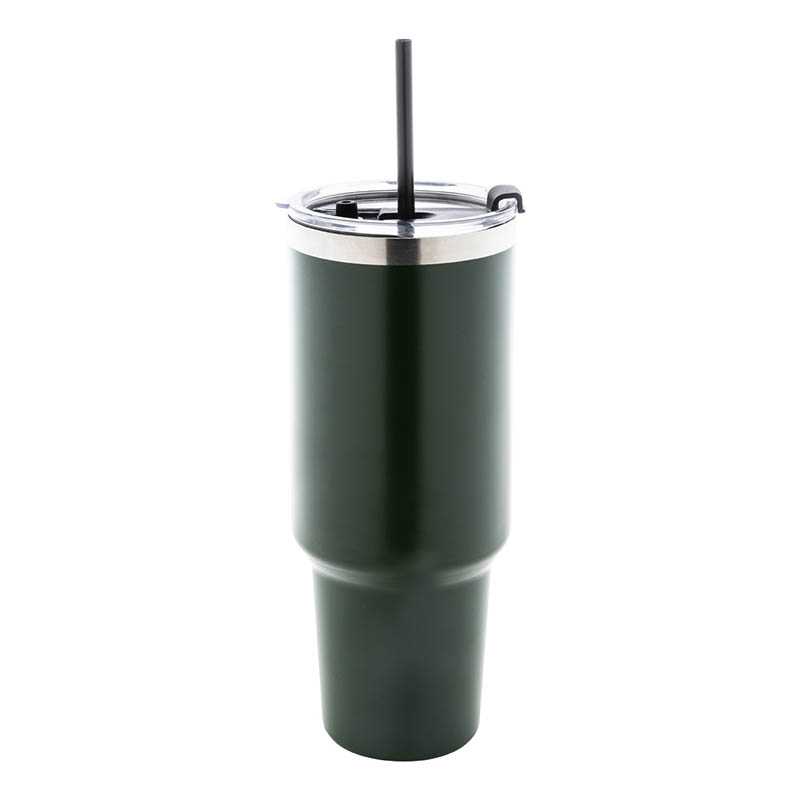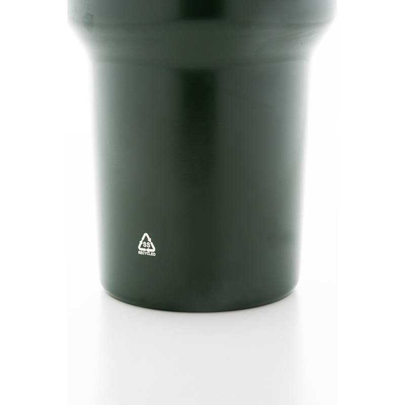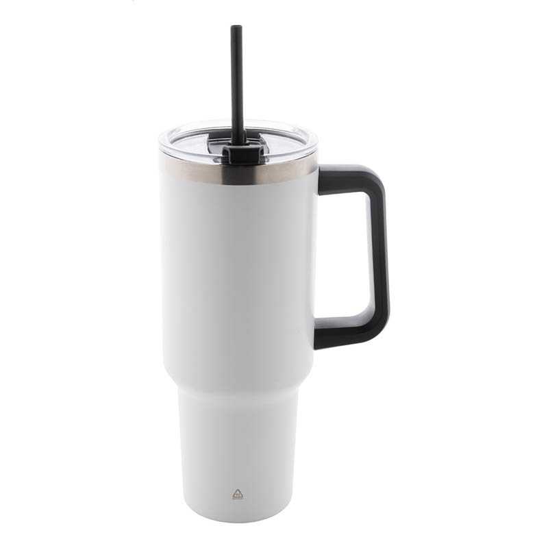 Dvoustěnný hrnek z recyklovaného nerezu s víčkem a brčkem z PE. Objem 1200 ml. (90 % recyklované nerezové oceli a 10 % nerezové oceli).