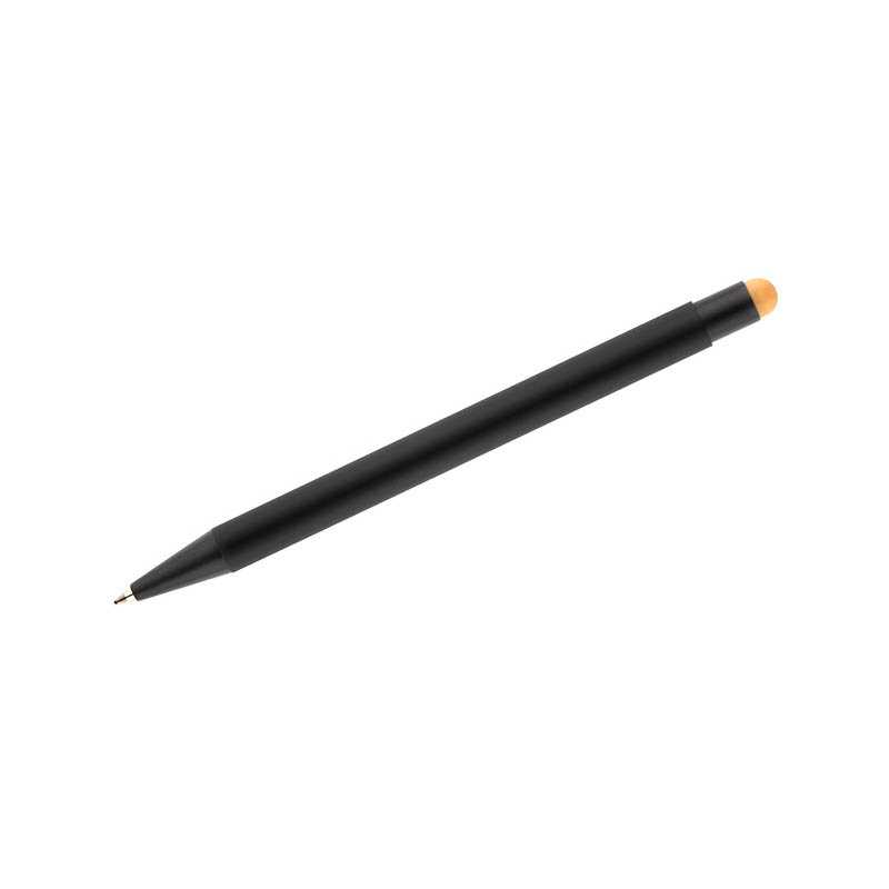 Hliníkové guľôčkové a dotykové pero s bambusovým úchopom a pogumovaným povrchom. So špeciálnou povrchovou úpravou pre zrkadlové gravírovanie zodpovedajúce farbe dotykového pera. S modrou náplňou.