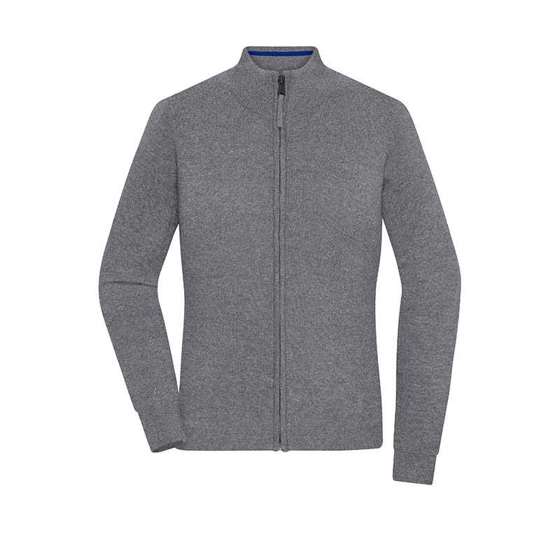 Fine knitted cardigan. Men's style with full zip and double knitted collar. Buttoned ladies cardigan with open round neck. Folded at sleeve and bottom hem. // 50% cotton, 50% Dralon® (acrylic), 12 gg // 145 grey melange, 565 blue fog, 600 navy, 900 black > S–XXXL + XS–XXL