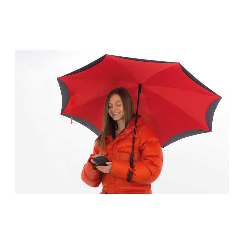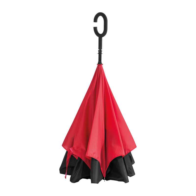 REVERSE "opačne fungujúci" skladací dáždnik z materiálu 190T pongee s "C" rukoväťou pre ľahké uchytenie na zápästí. Vďaka tomuto riešeniu môžete mať vždy voľné obe ruky.