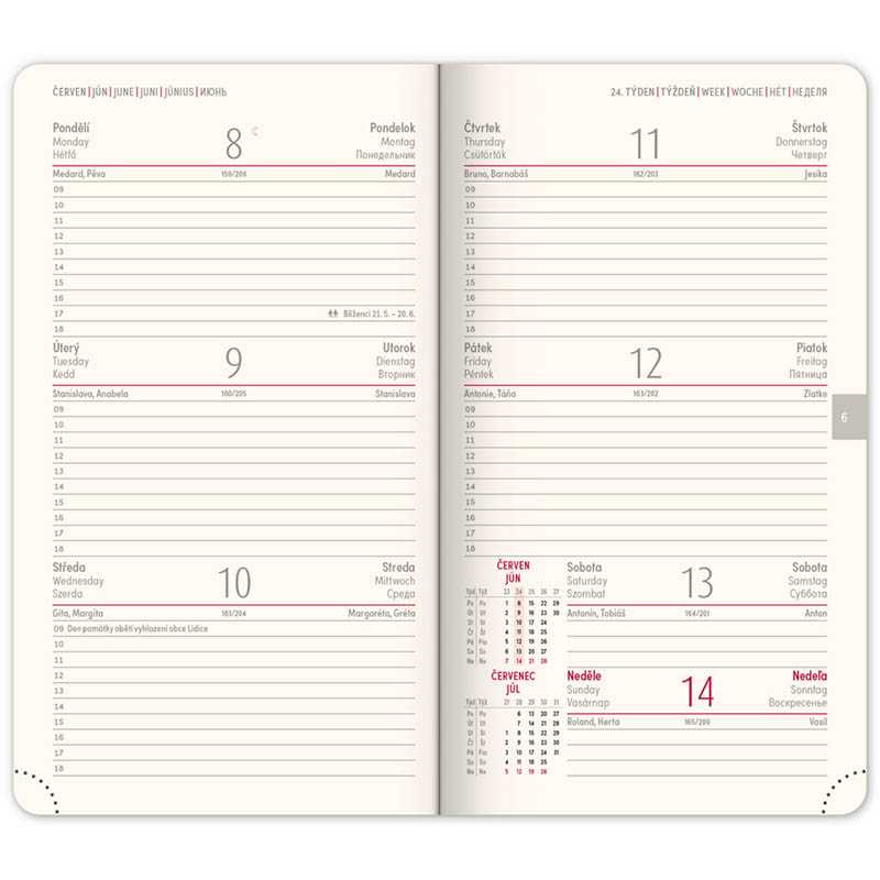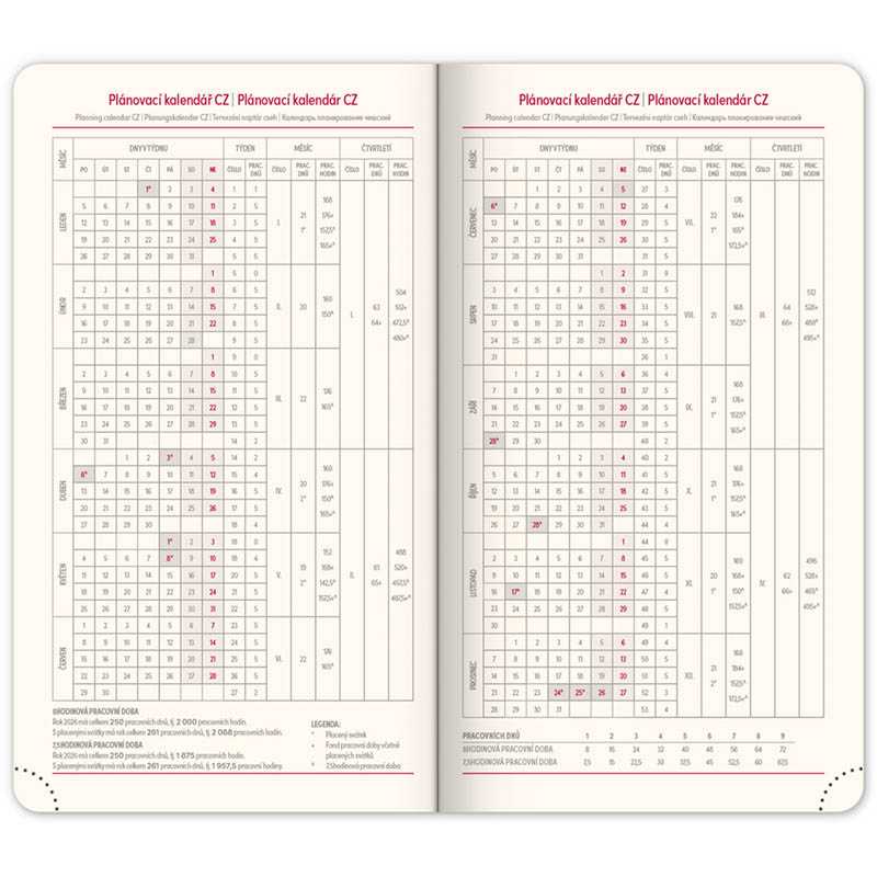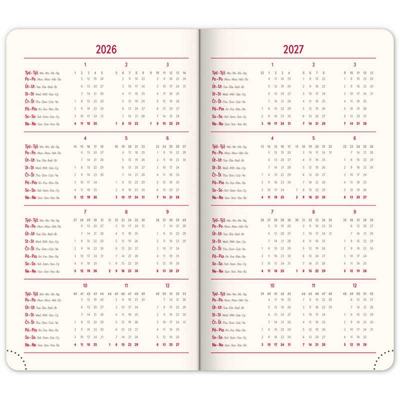 Nový rad diárov v modernom dizajne doplnenom o pevnú gumičku a pútko na pero. Týždenné rozloženie s česko-slovenským kalendáriom a doplnkovou angličtinou, nemčinou, maďarčinou a ruštinou.• kalendárium od decembra 2025• ročný plánovací kalendár 2026–2027 • pracovný plánovací kalendár • sviatky Českej a Slovenskej republiky a medzinárodné sviatky • rozšírený zoznam českých mien • miesto pre osobné údaje • perforované rožky• priestor pre poznámkyRozsah: 128 strán. Rozmer: 9 x 15,5 x 1 cm. Hmotnosť: 0,08. Papier: 70 g/m2 krémový papier. Väzba: tuhá knižná s gumičkou a pútkom na ceruzku. Kalendárium: 6 jazyčné (CZ, SK, GB, DE, HU, RU) .
